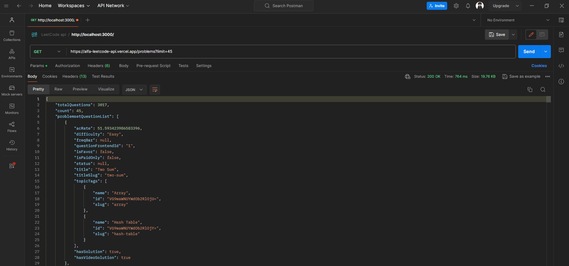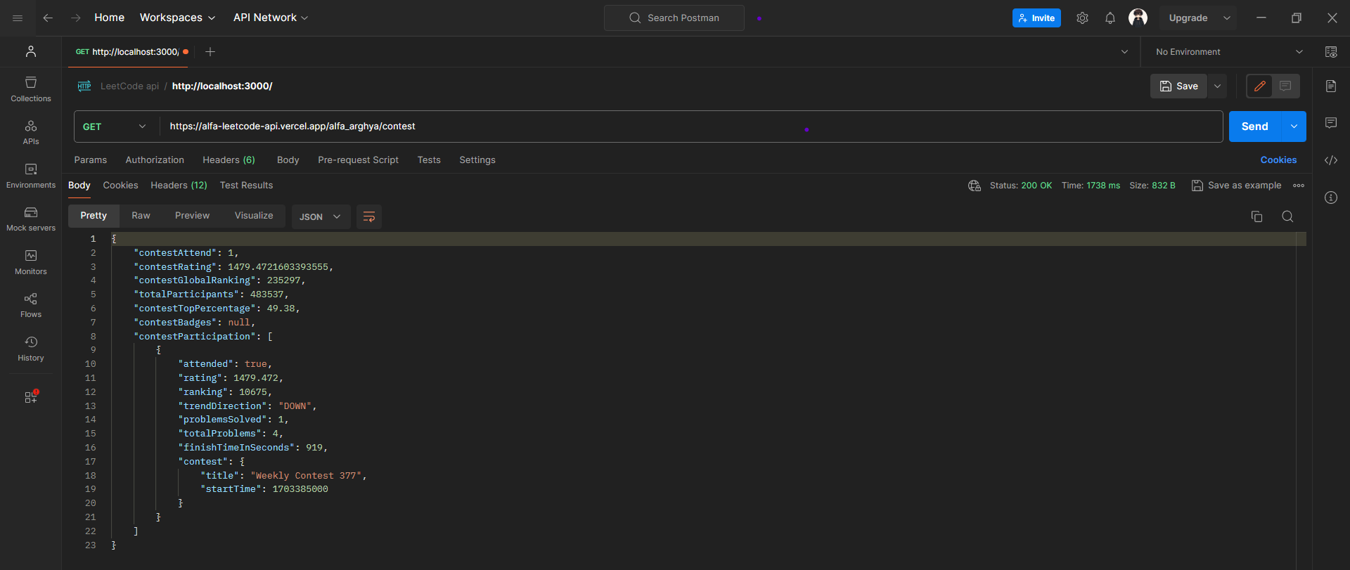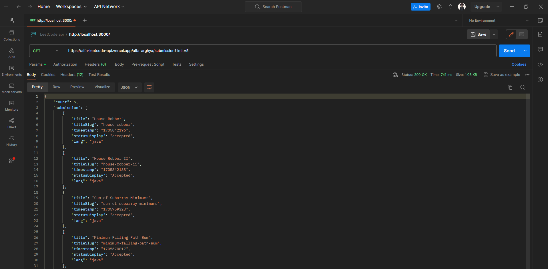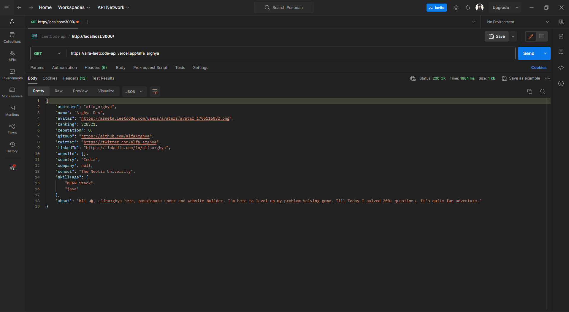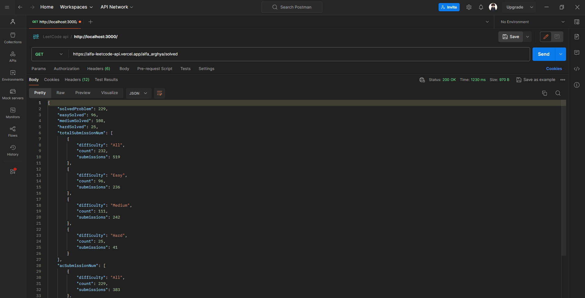 alfa-leetcode-api is a custom solution born out of the need for a well-documented and detailed LeetCode API. This project is designed to provide developers with endpoints that offer insights into a user’s profile, badges, solved questions, contest details, contest history, submissions, and also daily questions, selected problem, list of problems.