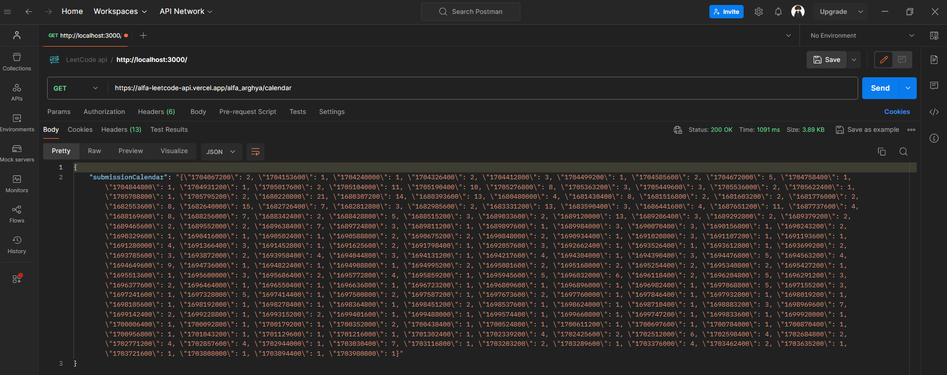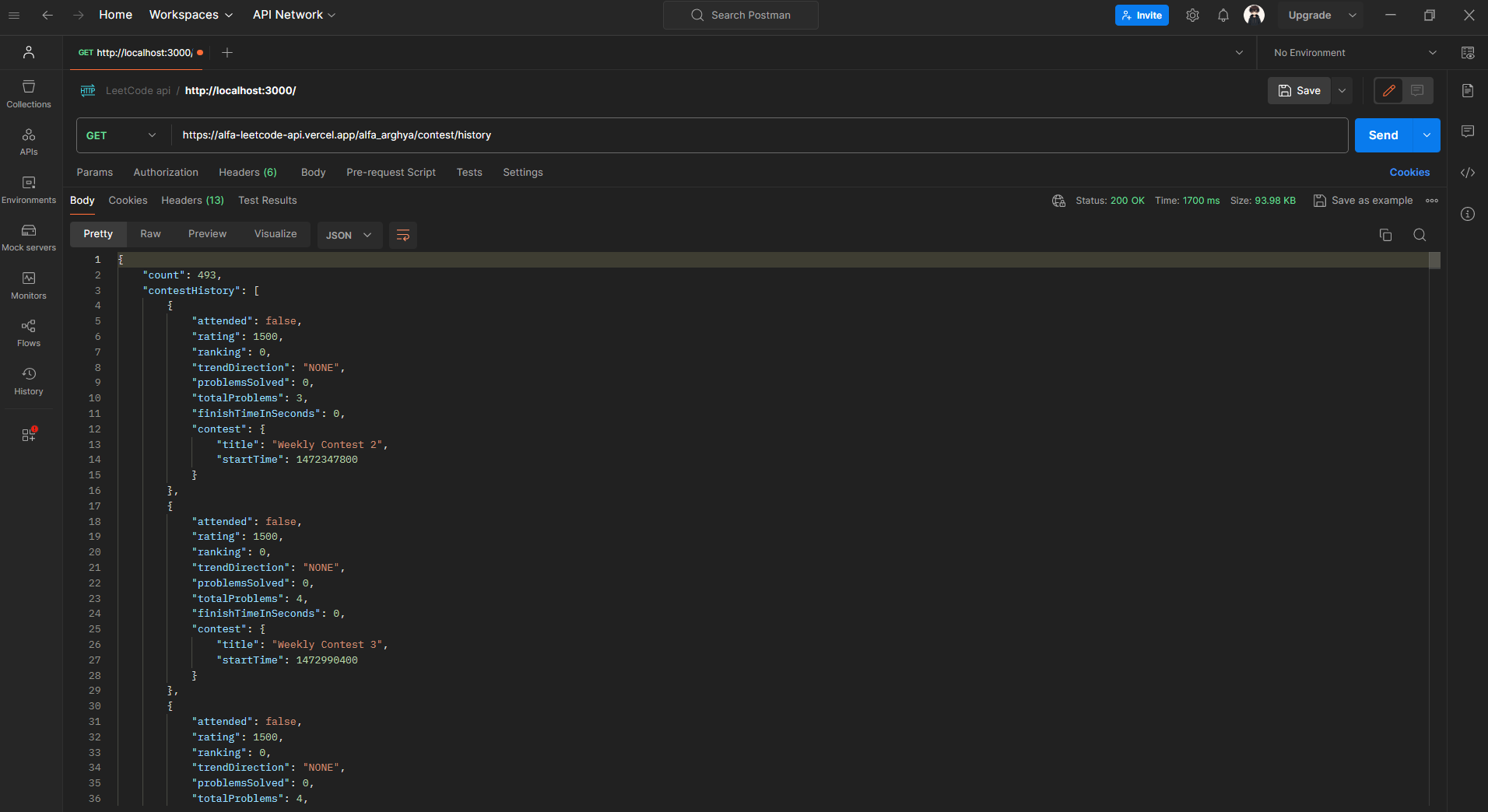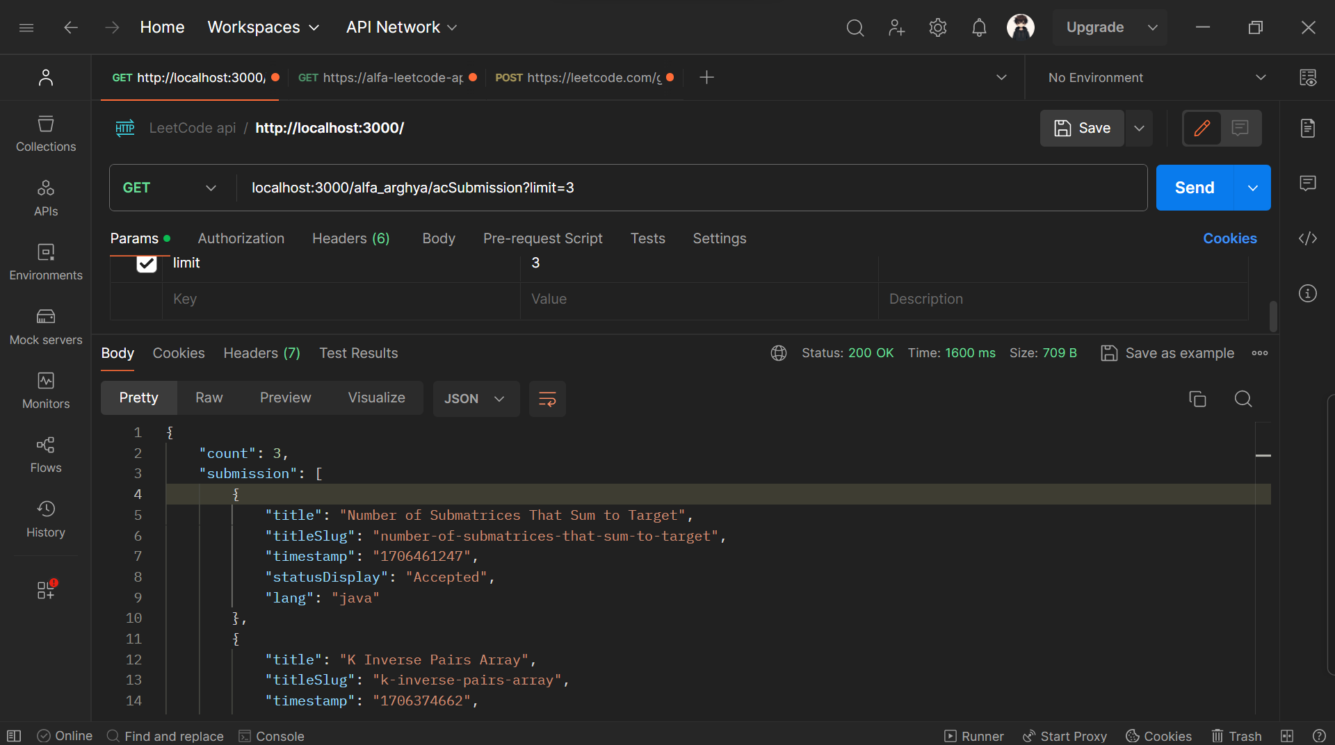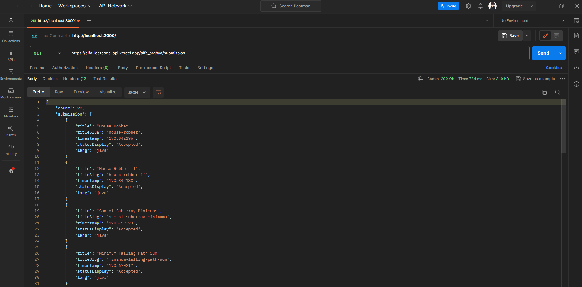 alfa-leetcode-api is a custom solution born out of the need for a well-documented and detailed LeetCode API. This project is designed to provide developers with endpoints that offer insights into a user’s profile, badges, solved questions, contest details, contest history, submissions, and also daily questions, selected problem, list of problems.