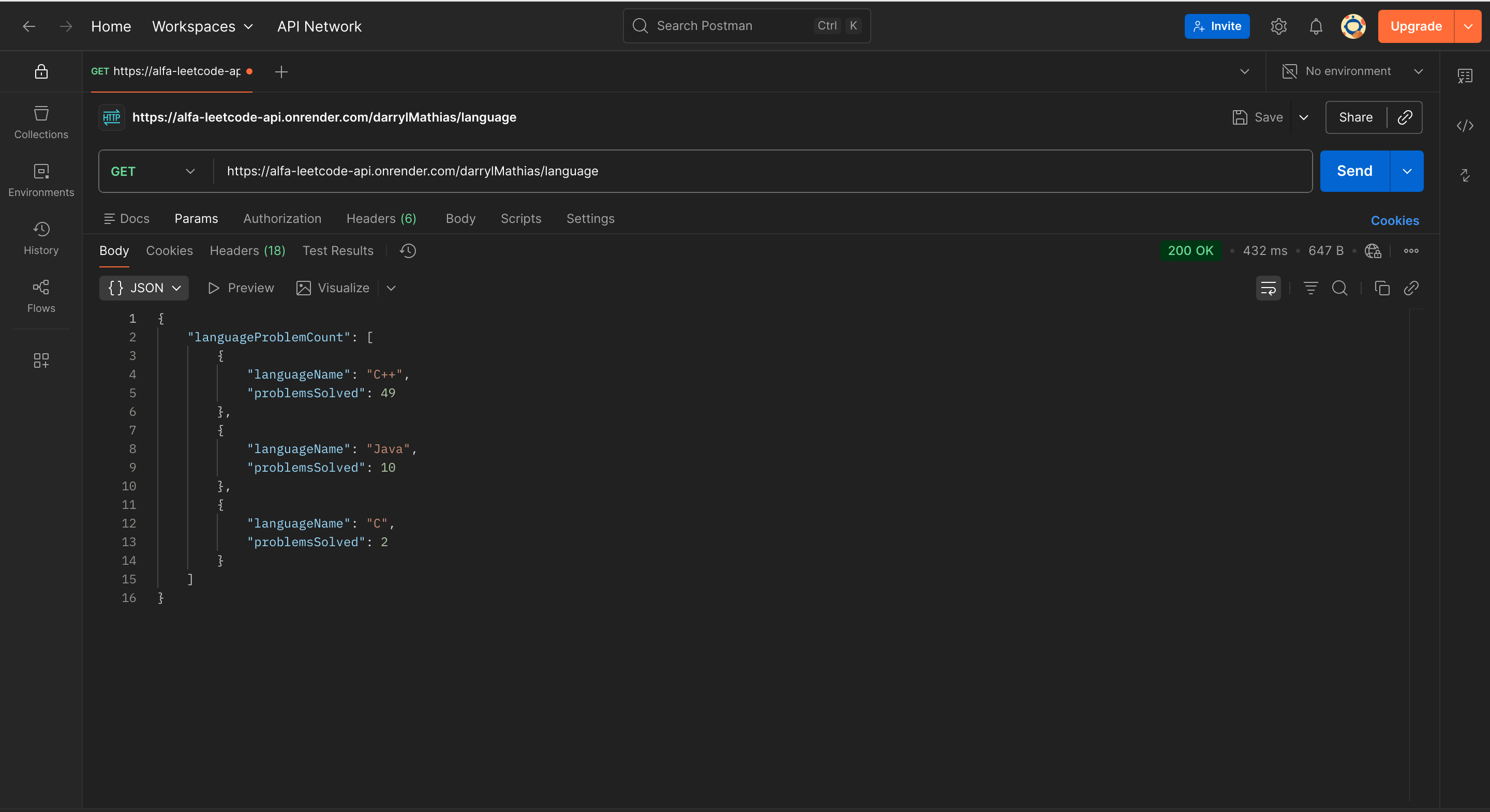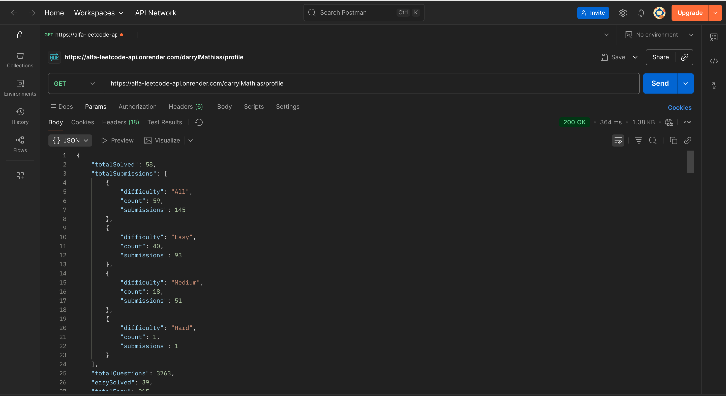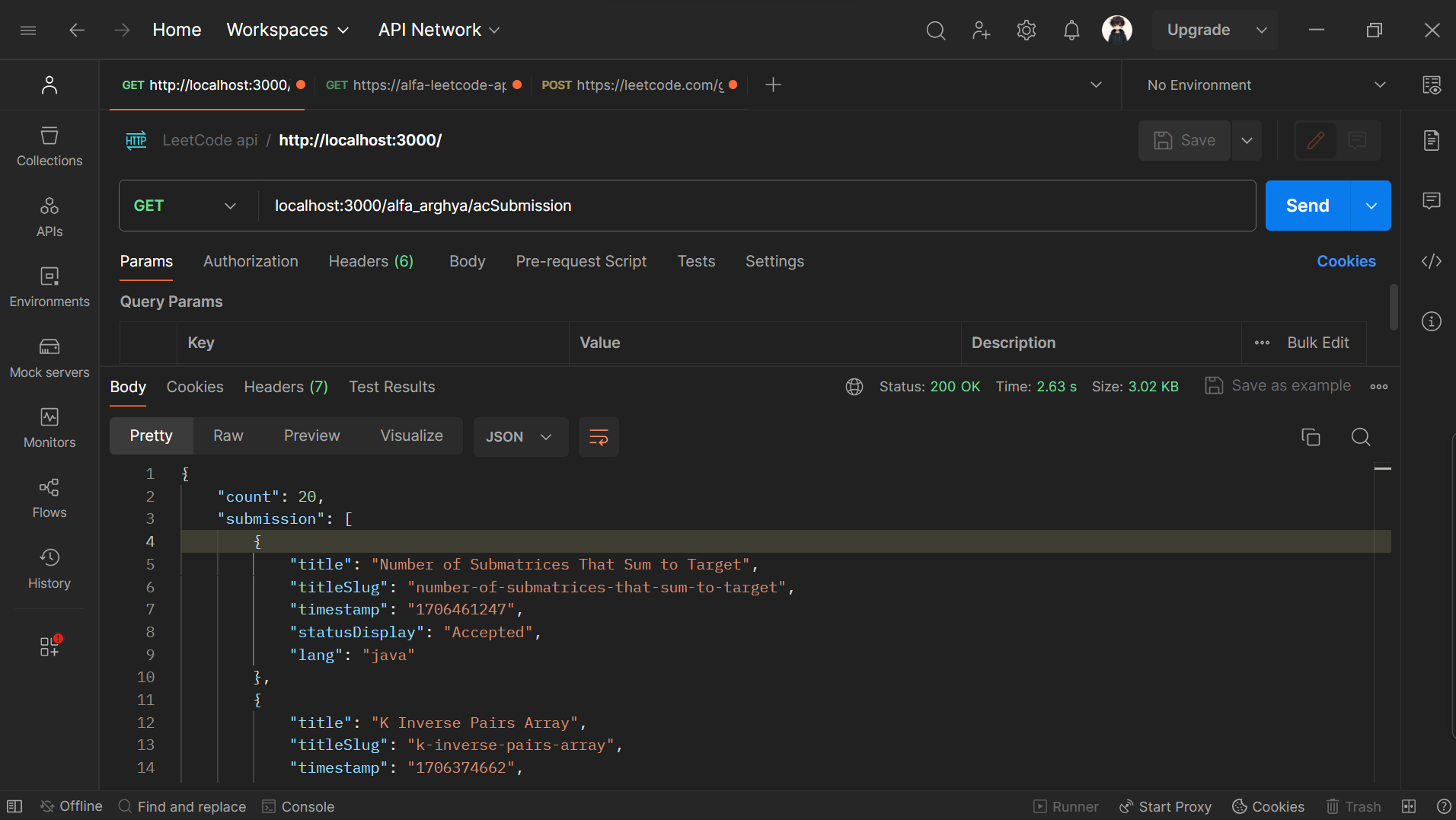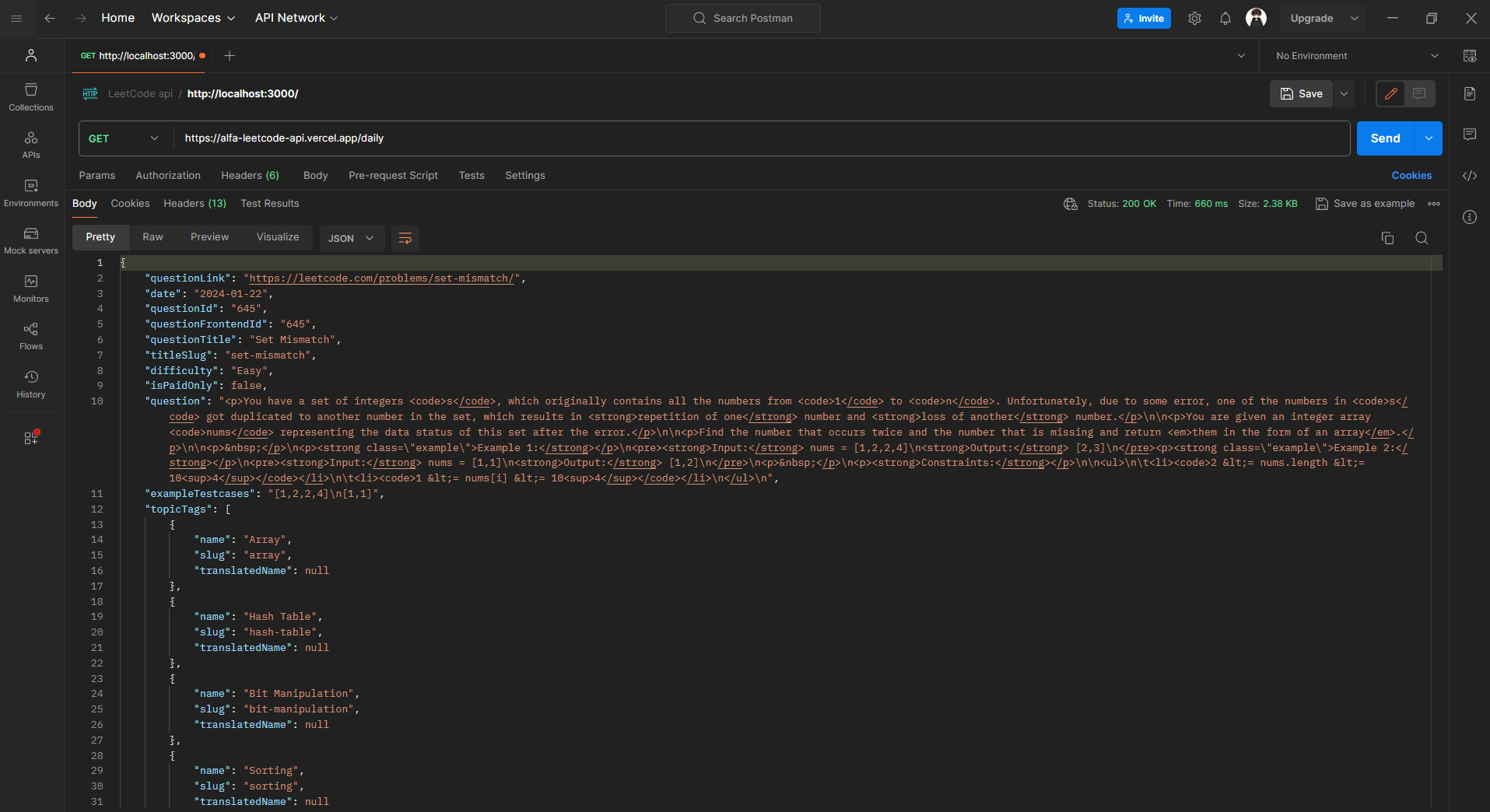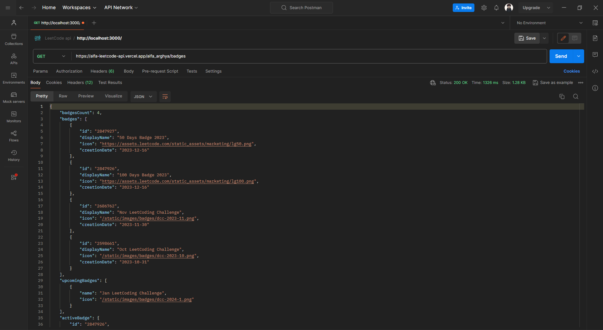 alfa-leetcode-api is a custom solution born out of the need for a well-documented and detailed LeetCode API. This project is designed to provide developers with endpoints that offer insights into a user’s profile, badges, solved questions, contest details, contest history, submissions, and also daily questions, selected problem, list of problems.