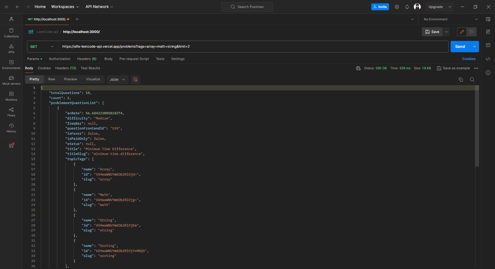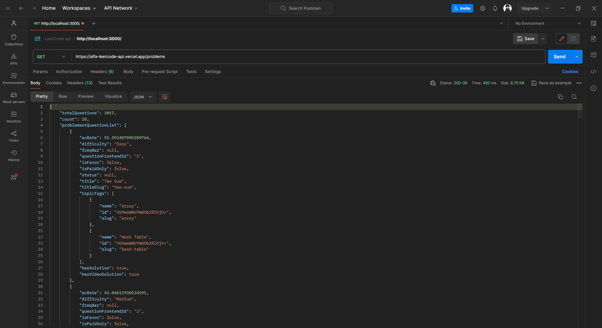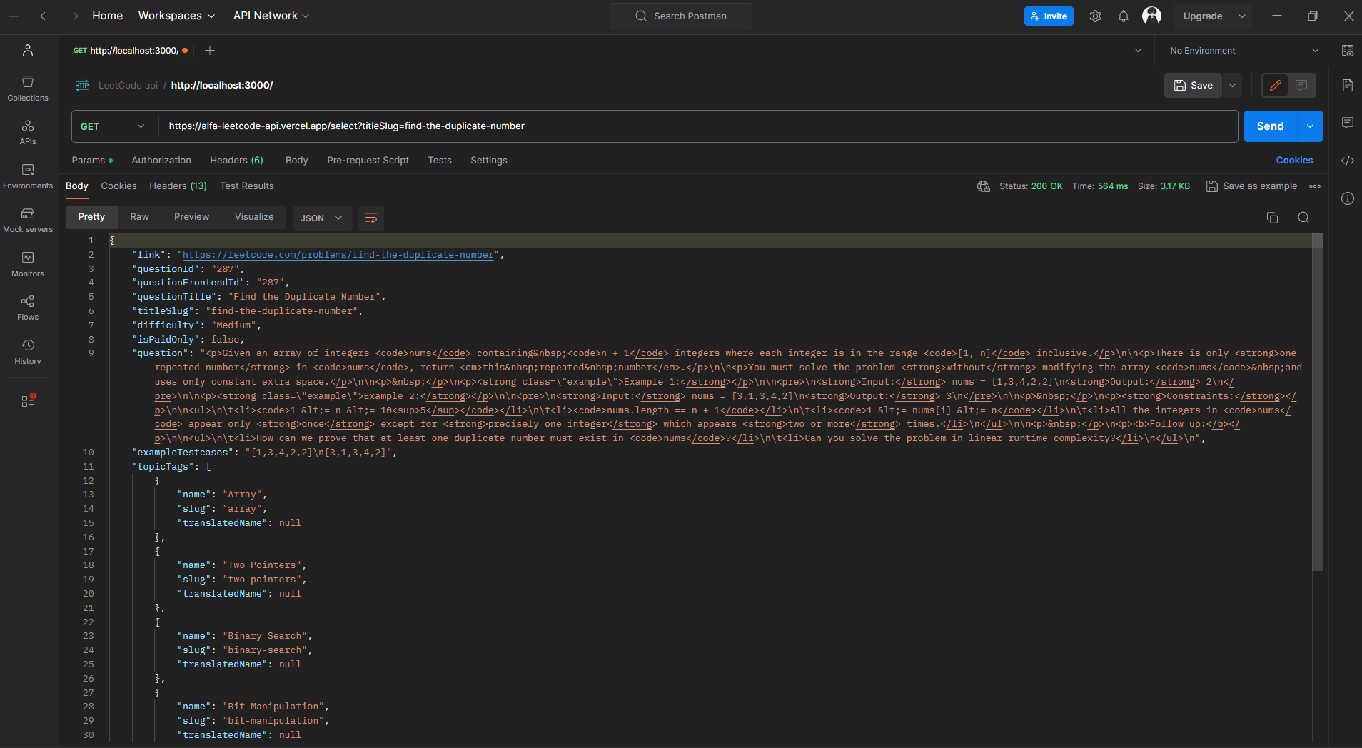 At First, I struggled to find proper documentation for the leetcode.com/graphql. After scouring various articles about the LeetCode public API, I still couldn’t find the comprehensive documentation I was looking for. Fueled by the desire to fill this gap I created alfa-leetcode-api.